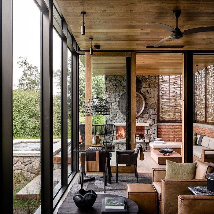 Singita Kwitonda Lodge is set in an area of exceptional natural beauty, with breathtaking views of the Sabyinyo, Gahinga and Muhabura volcanoes and the surrounding high-altitude forests. All of the suites offer uninterrupted views and have been designed as a luxurious refuge for post-trek relaxation with a cozy sitting area warmed by a fireplace. Thoughtful in-room conveniences include a well-stocked pantry and minibar and a private dining space. A private terrace with a fireplace and heated plunge pool encourages closer engagement with the surrounding landscape. The contemporary suites and villa are linked by volcanic rock pathways to the central lodge. The lodge interiors emphasize local design and handcrafted details adorn the carefully planned spaces. Layered textures and colors enhance the reflective quality of this tranquil haven and an experiential enclave offers free-flowing indoor and outdoor areas. A convivial fire pit, interactive kitchen, bar-deli and wine cellar complete the picture.